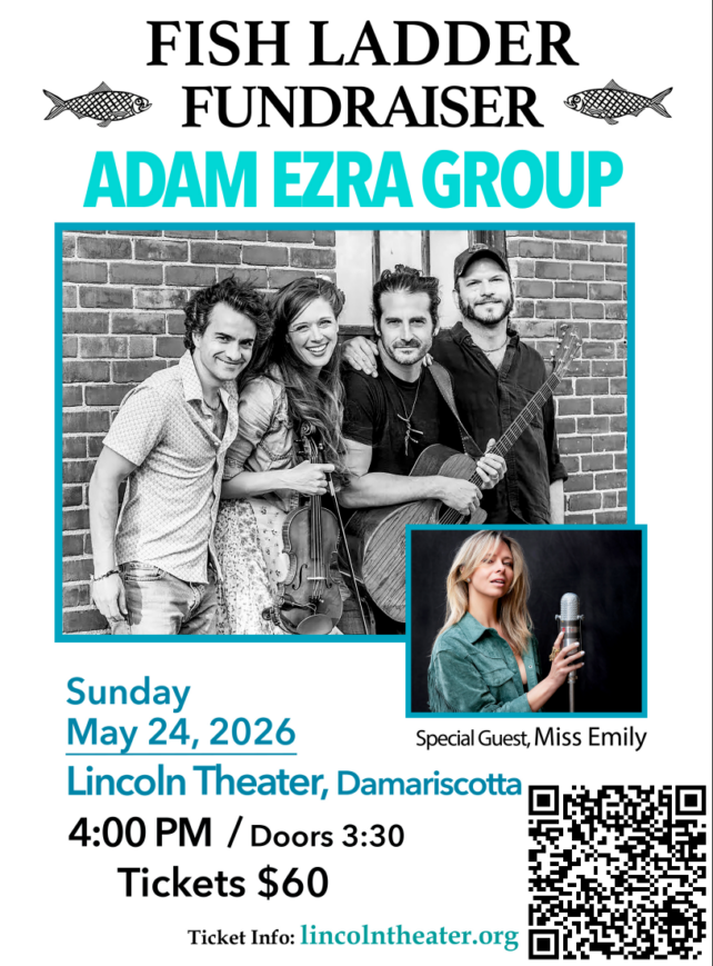 Long-time friend of the Fish Ladder, Adam Ezra Group – Corinna Smith (fiddle), Alex Martin (drums), Poche Ponce (bass) – return to Damariscotta in 2026. Fusing folk intimacy and rock energy with soul power and pop charm, the band first emerged from Boston in the early 2000s and quickly garnered widespread acclaim for their bold, insightful songwriting and interactive, euphoric performances. From hole in the wall bars and house concerts to sold-out headline shows and dates with the likes of Little Big Town, The Wallflowers, Gavin DeGraw, Train, and The Wailers, Ezra and his bandmates treated every single gig like their last, attracting a die-hard following that believed not just in the music, but in their commitment to activism and social change, as well.